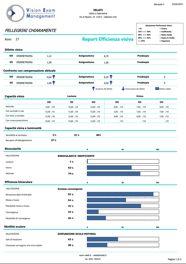 Al termine dell’esame visivo optometrico con Vem, verrà rilasciato un report descrittivo dell’efficienza visiva in formato digitale, completo di prescrizione ottica e dei parametri utili a definire, in modo chiaro e dettagliato, la condizione visiva.